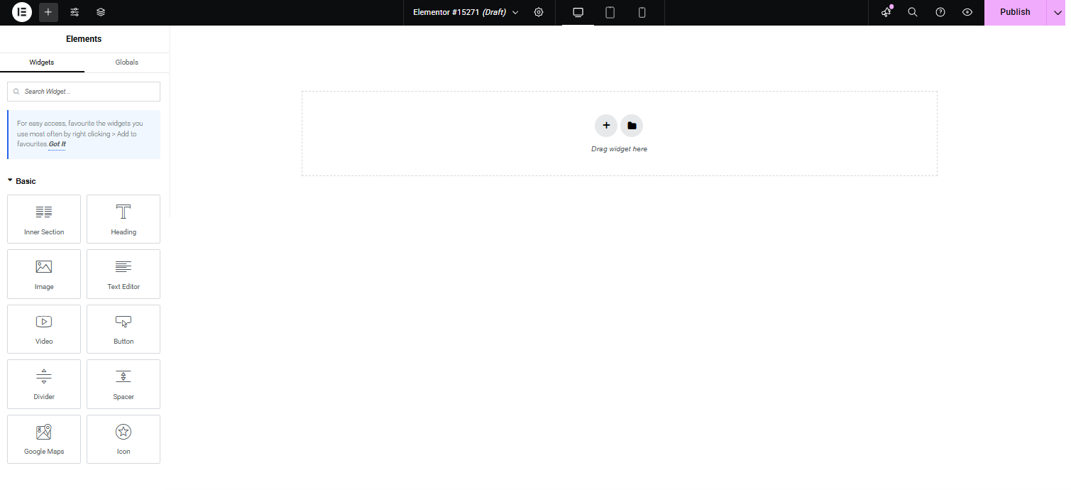 You can see the widgets on the left (there are more if you scroll) and an area where you can simply drag and drop the elements you like.
