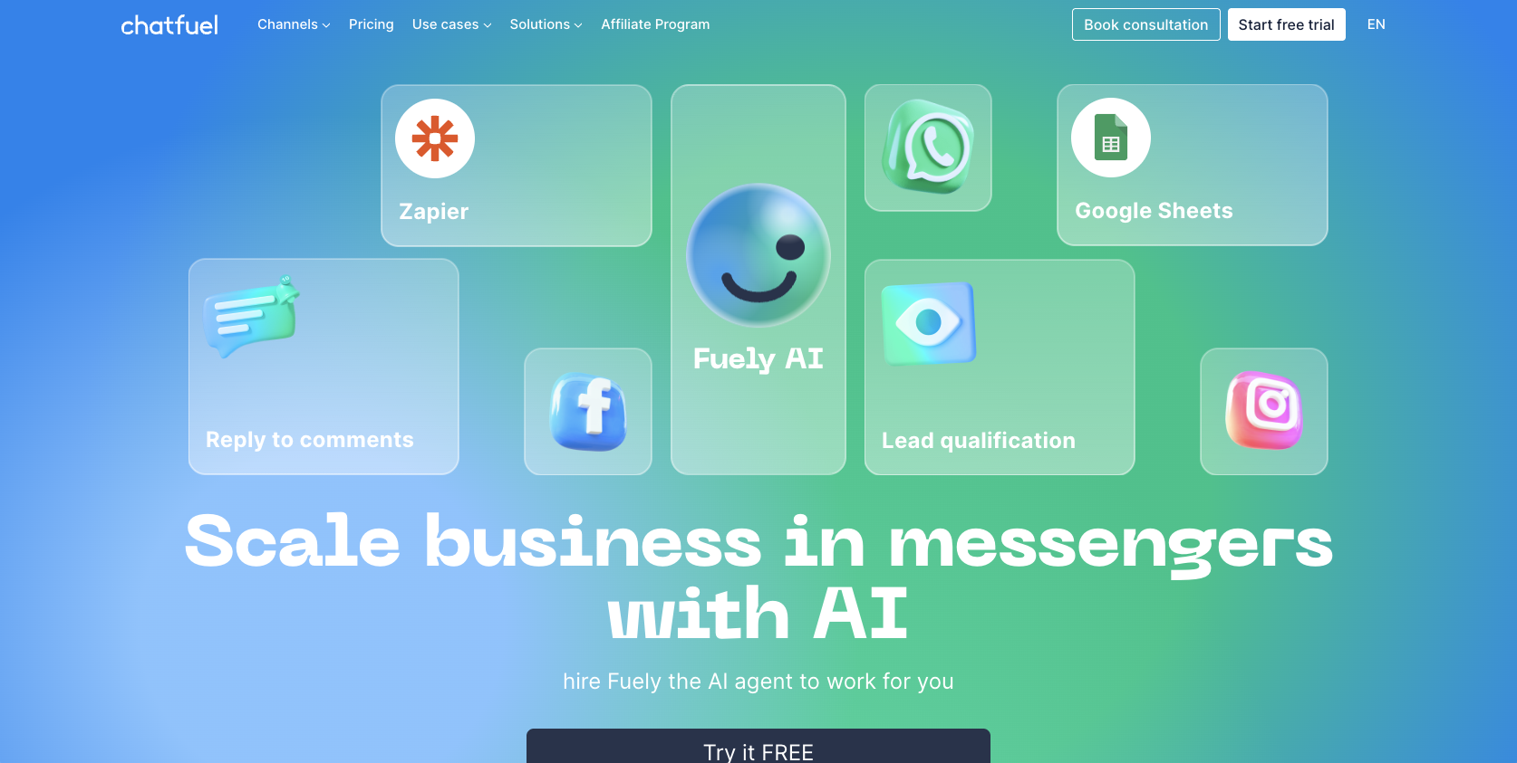 Pricing: Chatfuel offers a 7‑day free trial. Paid plans start around $23.99 per month for Facebook/Instagram (1,000 conversations), $34.49 per month for WhatsApp (1,000 conversations), and $300 per month for an Enterprise package with unlimited chats. There are additional costs for chat volume overages.