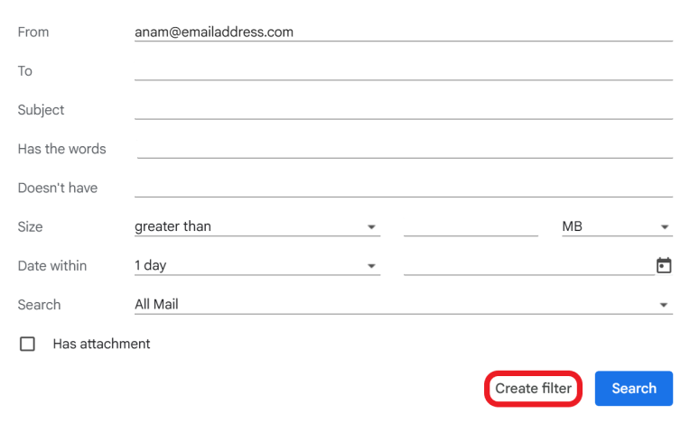 - Explore the different filtering criteria available: You can filter emails in many ways, such as from, to, body keywords, email size, and date sent.
