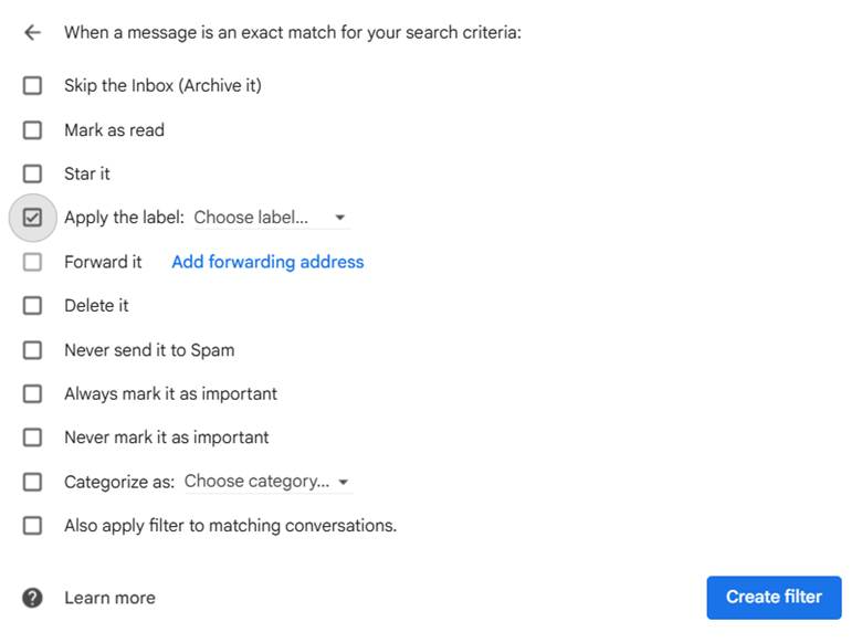 - Click Create filter. Repeat this process, creating as many automatic labels as you want or need.