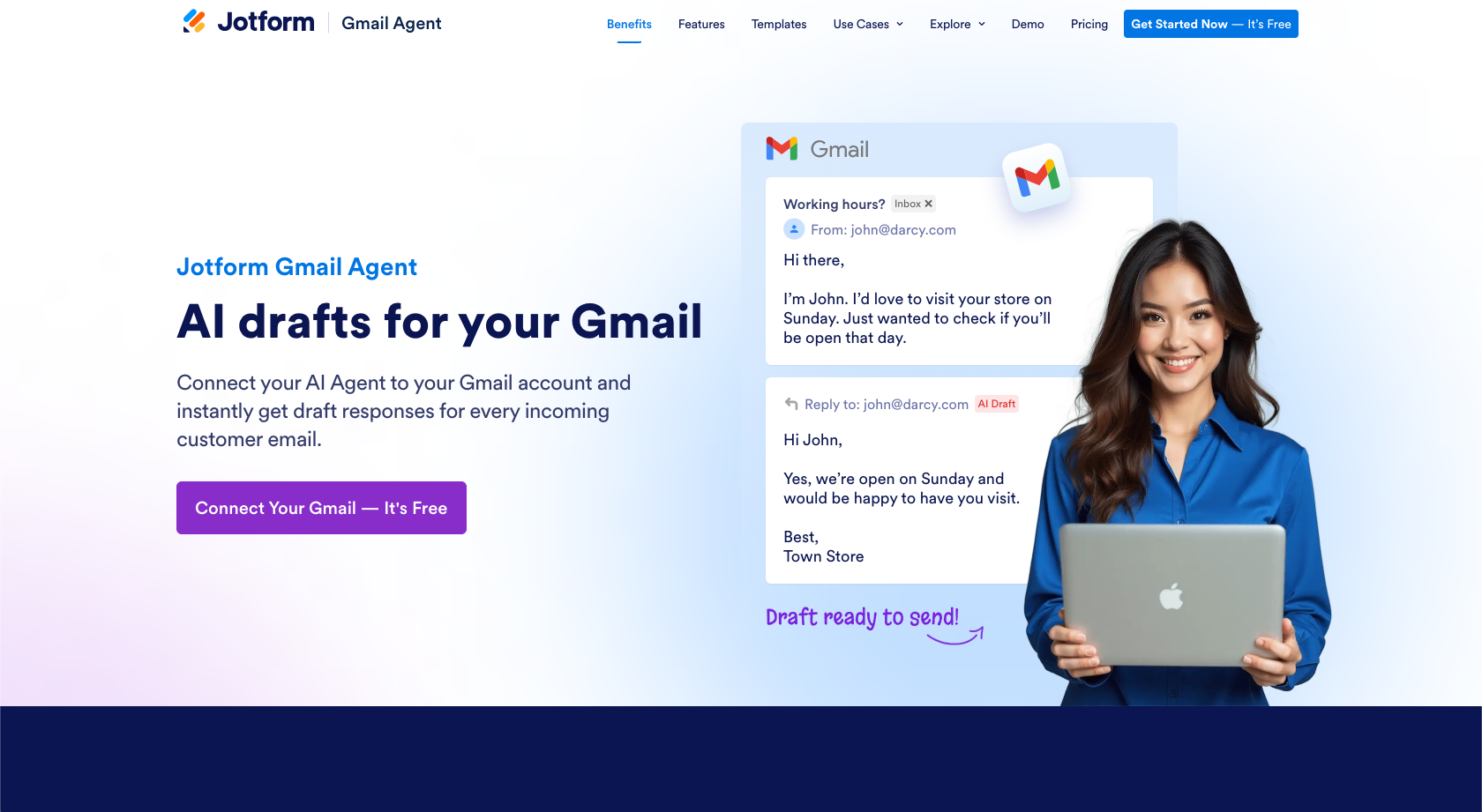 - Cost-effective solution: One of the leading AI agents available, Jotform Gmail Agent is free. There’s nothing standing between you and this dynamic, highly accessible tool.
