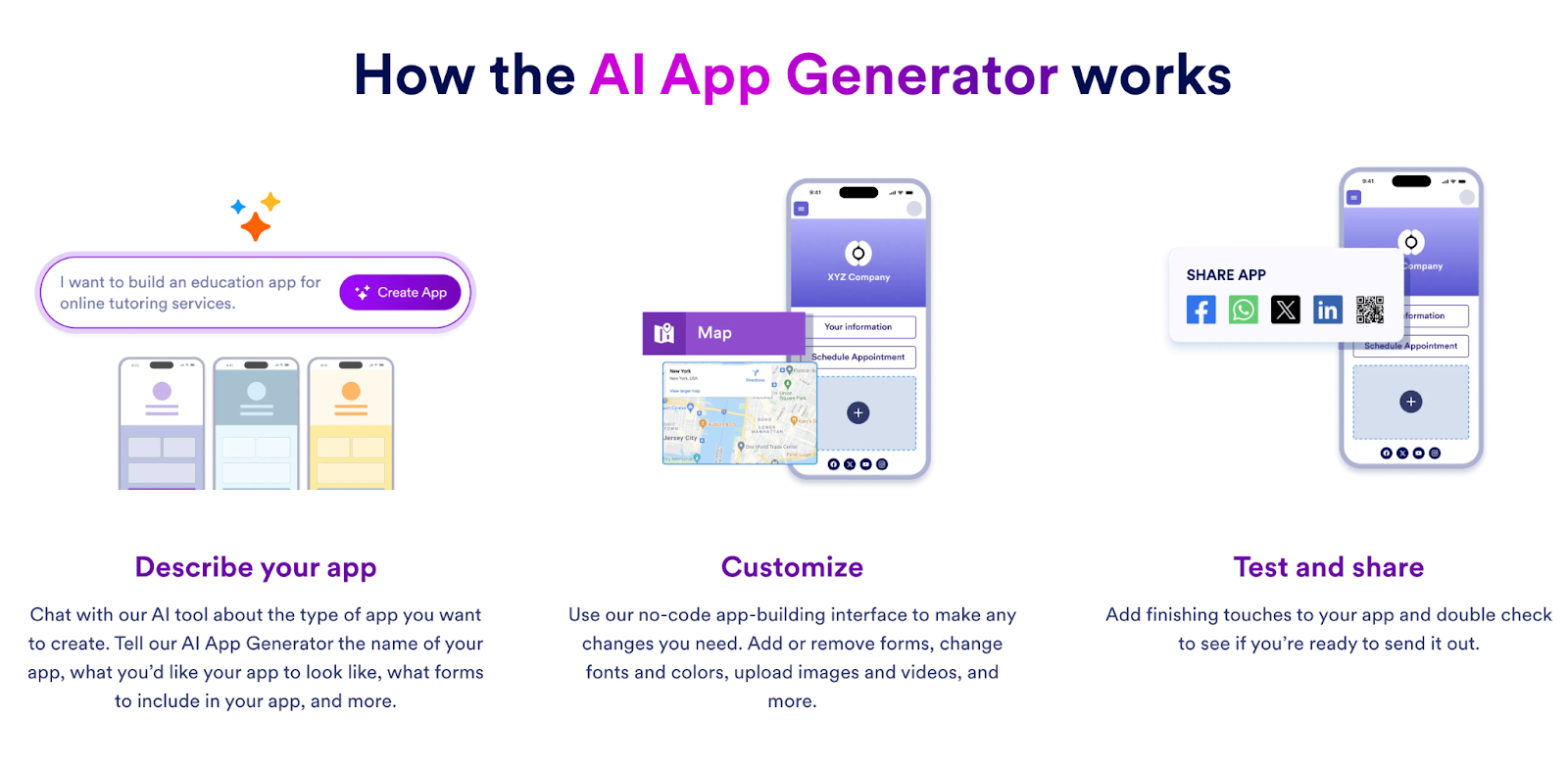 - You can’t publish to the App Store or Google Play directly yet. Apps are accessed through links, QR codes, or embeds, which is fine for internal use but might feel limiting for customer-facing products.
