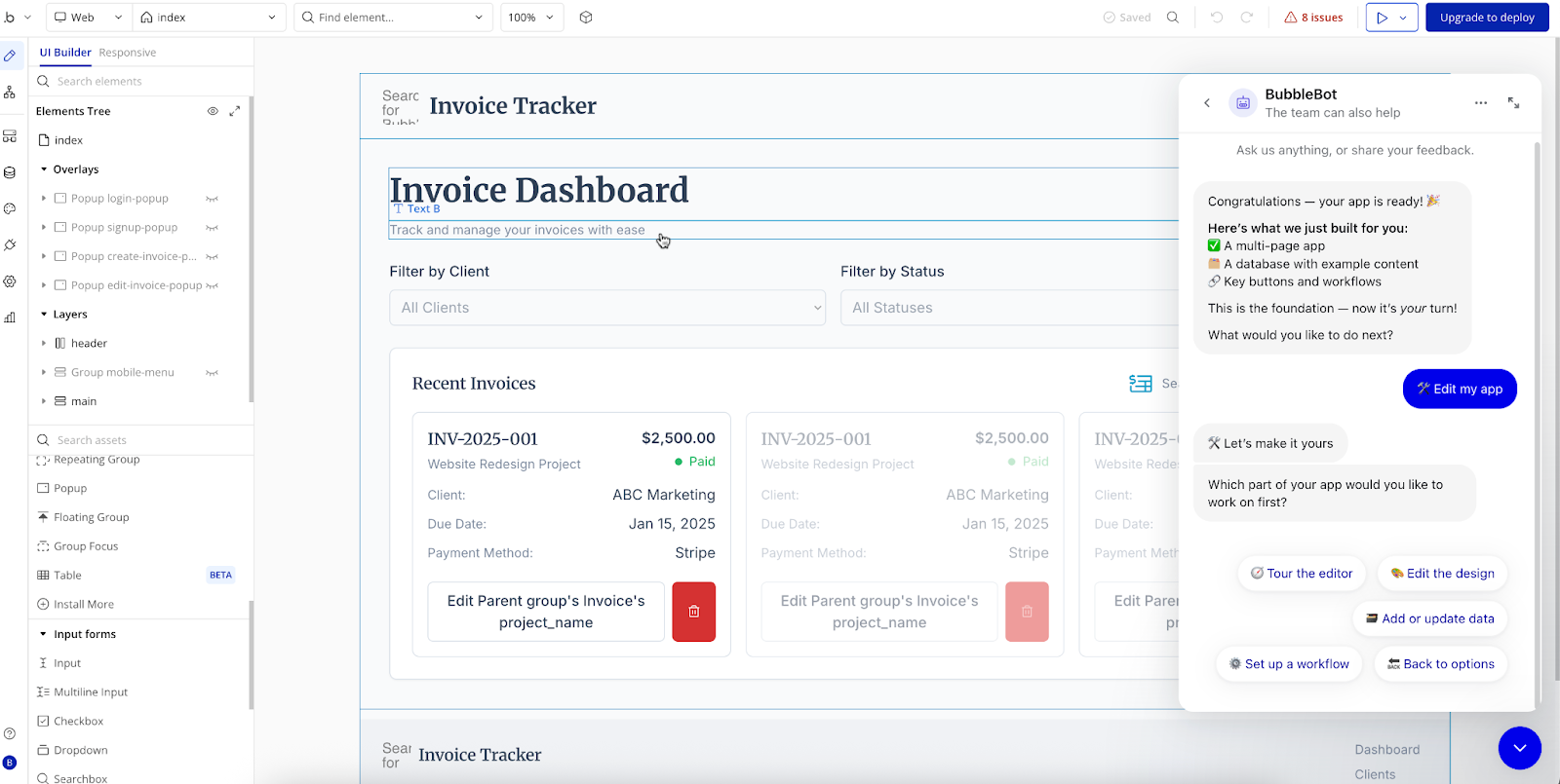 - AI-powered starter blocks: Once the app is generated, key elements like login pages, forms, or dynamic lists are automatically added and wired up.