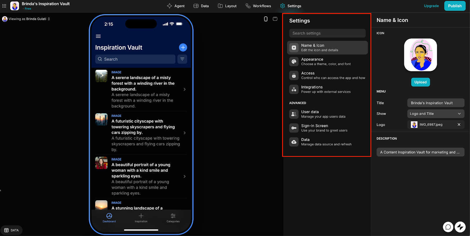 In under two minutes, it spun up a working prototype that included all the elements I asked for. From there, the workspace is split into three simple tabs — Build, Settings, and Publish — and the flow between them feels intuitive even if you’ve never built an app before.