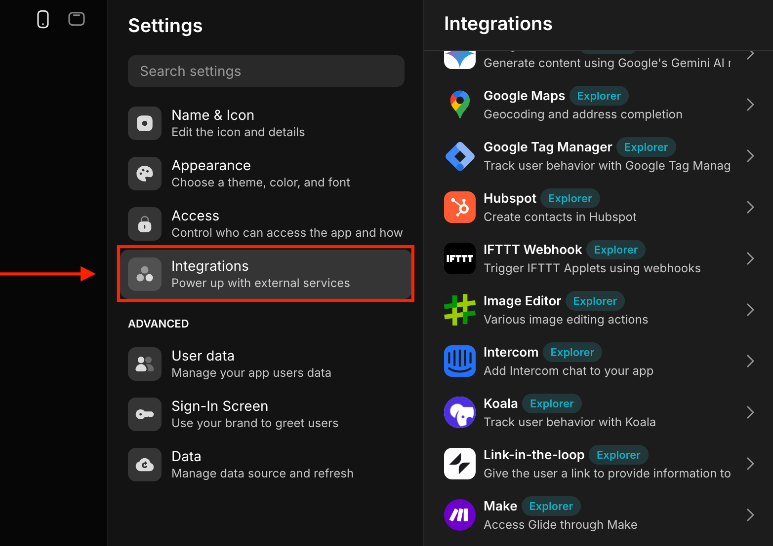 - Glide Tables: Use Glide’s own native database for faster load times, better performance, and smoother UX.