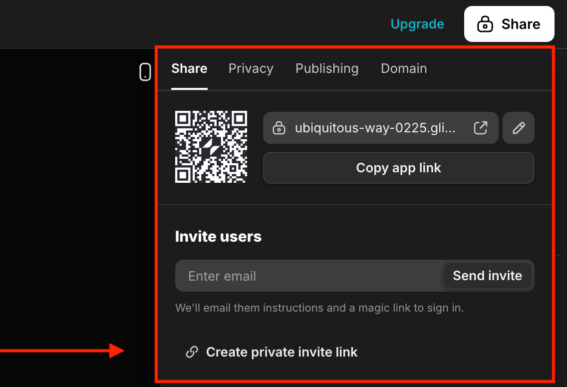 When it comes to sharing, Glide gives you the basics and then some. You can copy your app link, generate a QR code, or invite users directly — pretty useful whether you’re sharing internally or testing it with a few trusted folks. Privacy settings are just as flexible: You can make your app public, private, or require users to request access.