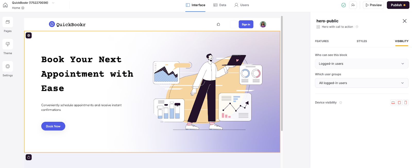 What I really like is how easy it is to manage visibility settings. Click any block, head to the Visibility tab, and you can decide who gets to see that section — say, only logged-in users.