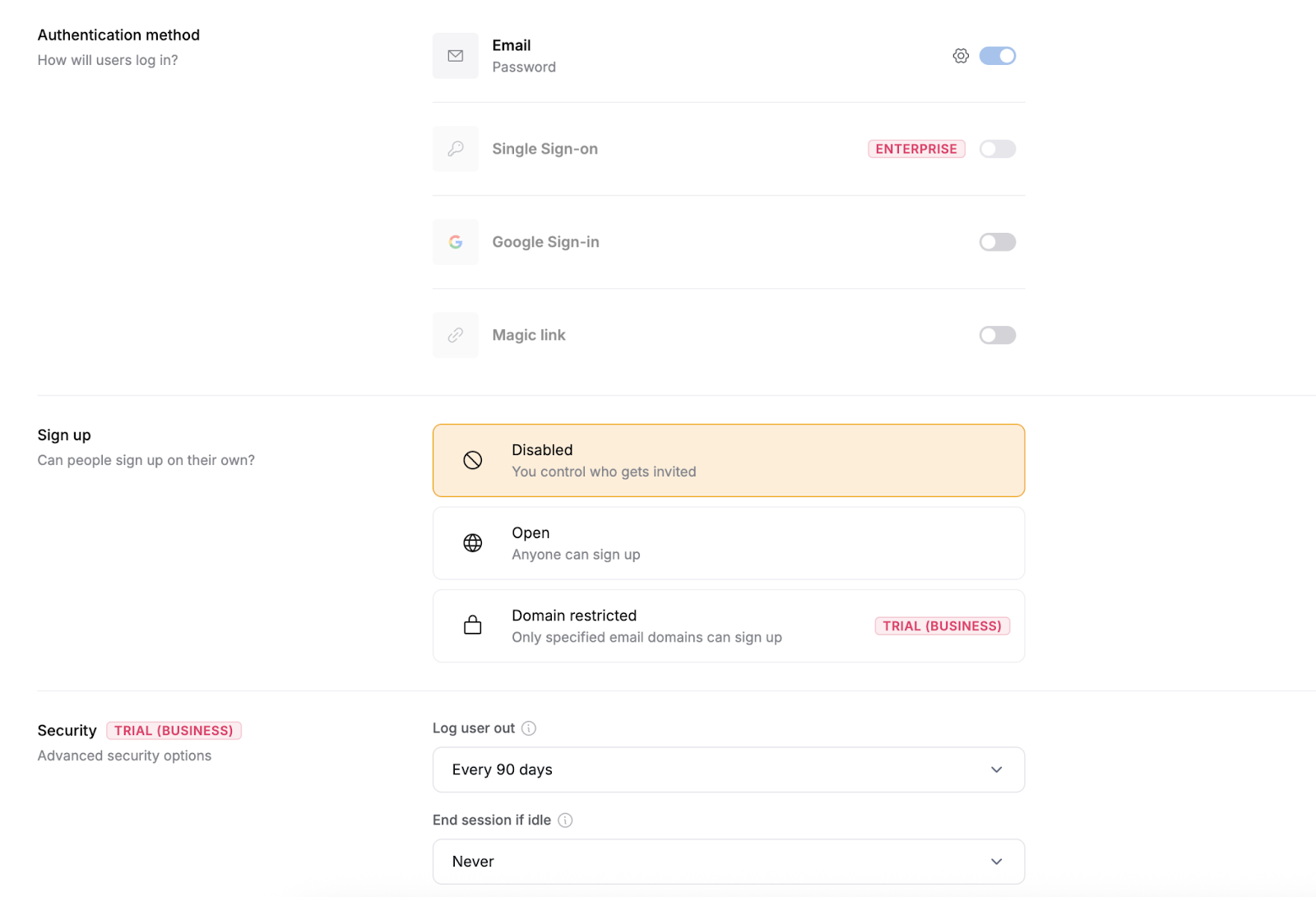 On the Business plan, you can auto-logout users after seven days or end a session if they’ve been idle for five or 15 minutes. Authentication methods are flexible too: standard email plus password, Google sign-in, magic links, or even one-time codes. SSO is available, but it’s locked behind the Enterprise plan.