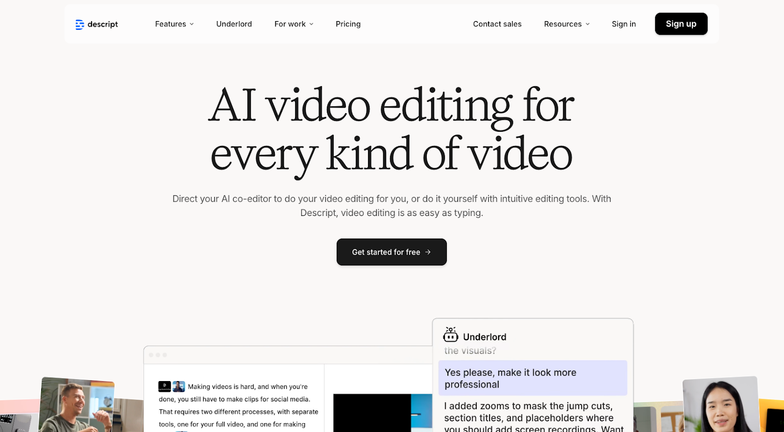 Descript reimagines video editing as text editing – allowing users to cut, overdub, and generate visuals by editing a script. It’s perfect for podcasters, educators, and content teams who want fast, narrative-driven video creation.