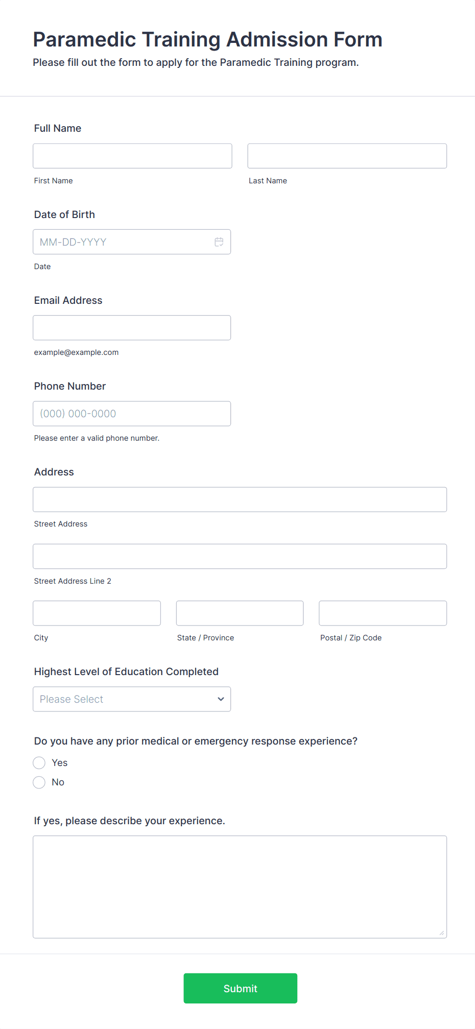 • For job applications, include fields for personal information, education, work experience, references, and file uploads for resumes or cover letters.