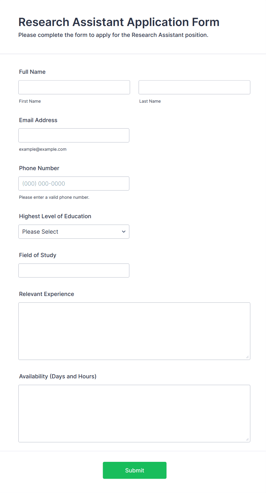 - For job applications, include fields for personal information, education, work experience, references, and file uploads for resumes or cover letters.