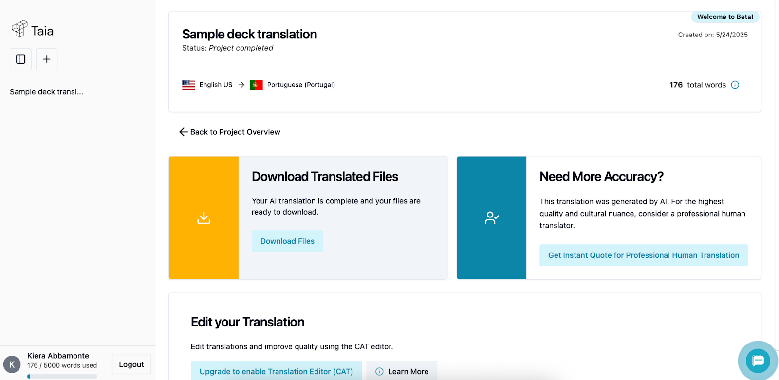 Wenn wir über die Übersetzung von Dokumenten sprechen, müssen wir auch über die Beibehaltung von Formatierung und Layout sprechen – und Taia hat mich hier nicht enttäuscht. Als ich ein Foliendokument zur Übersetzung hochlud, sah das Design des Ausgangsdokuments völlig unverändert aus. Das ist für jeden wichtig, der schon einmal Stunden damit verbracht hat, ein übersetztes Dokument neu zu formatieren.