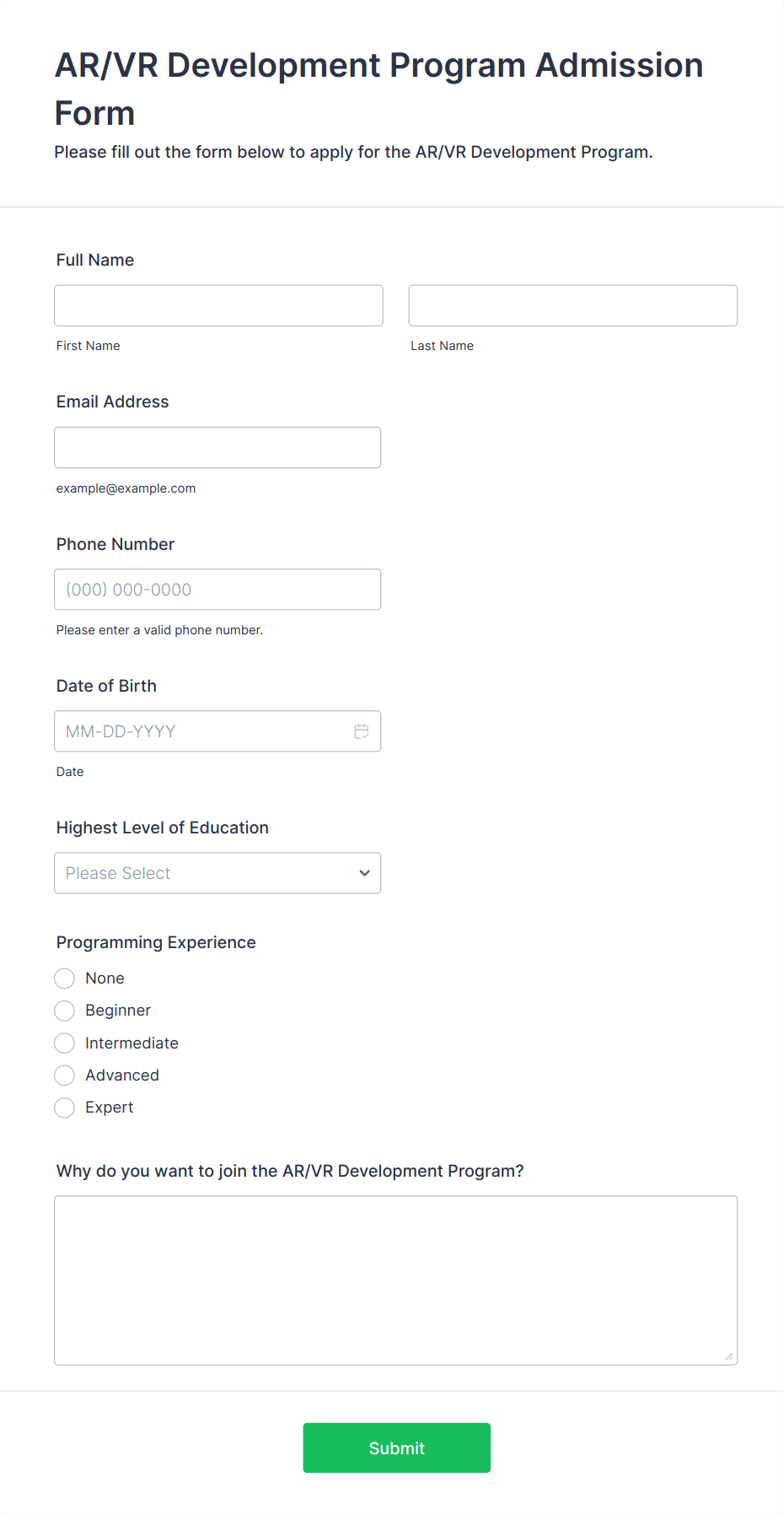 The AR/VR Development Program Admission Form is designed for educational institutions and organizations offering immersive technology programs. This form allows prospective students to submit their applications, providing essential information such as personal details, educational background, and relevant experience in AR/VR development. By utilizing this form, schools and training centers can efficiently collect applications, screen candidates, and manage the admissions process smoothly. Ideal for tech-focused institutions, this template streamlines the initial stages of enrollment, ensuring that the right candidates are selected for the program.