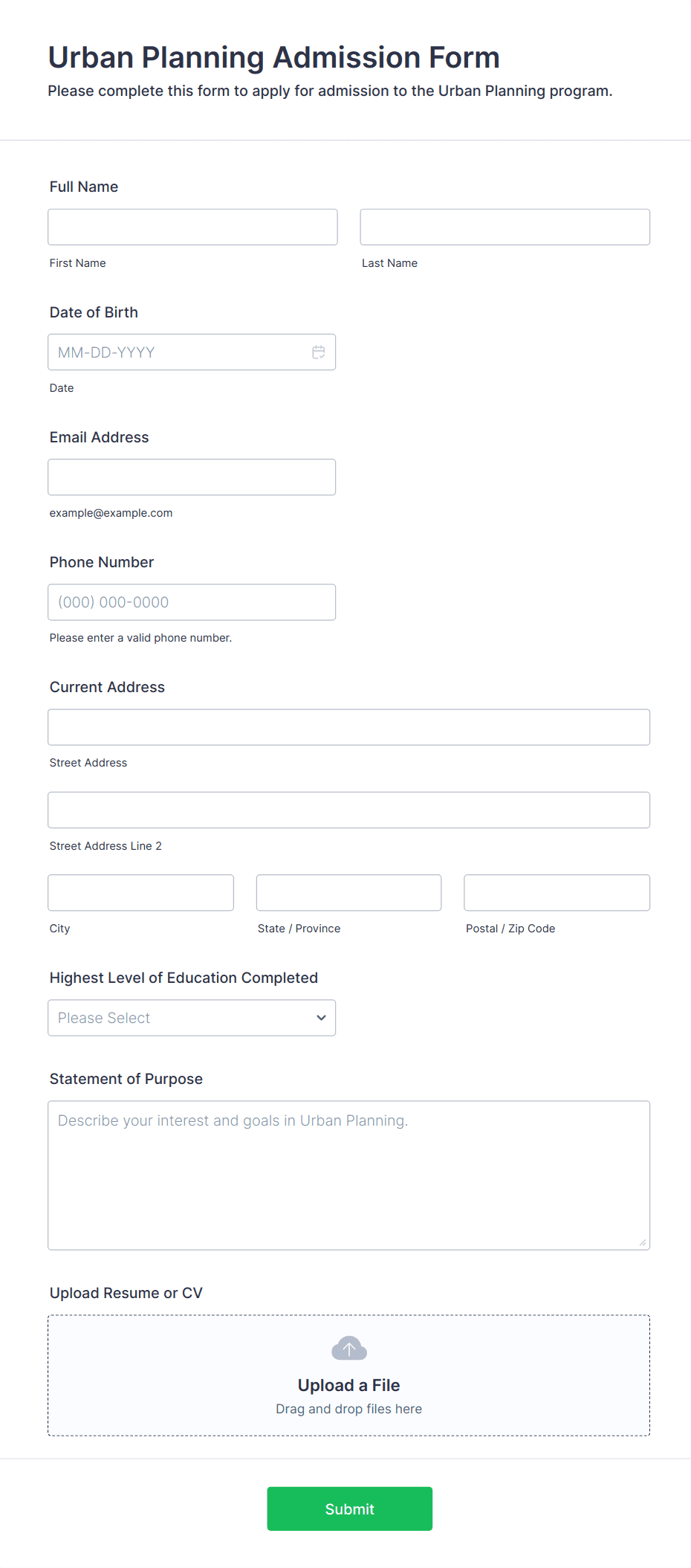 With Jotform's no-code Form Builder, customizing the Urban Planning Admission Form is a breeze. The drag-and-drop interface allows users to easily add or rearrange fields, incorporate conditional logic to display relevant questions, and integrate with various applications for seamless data collection. Institutions can also personalize the form's URL and design to reflect their branding, ensuring a professional appearance. The automatic data storage feature ensures that all submissions are securely stored and easily accessible, making it an essential tool for educational administrators.