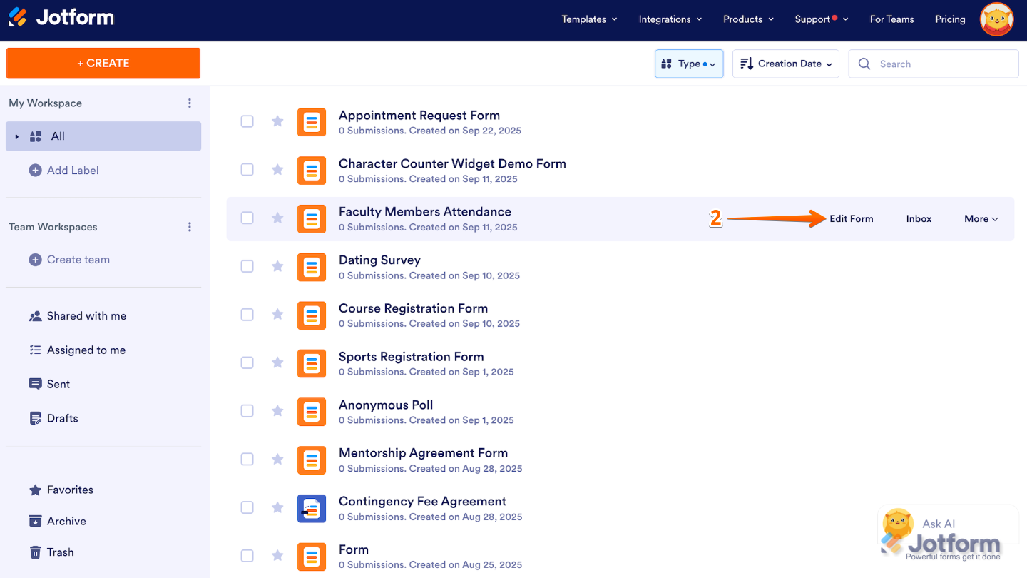 - Now, hover your mouse over the form you want to manage, and then click on Edit Form on the right side of the page.