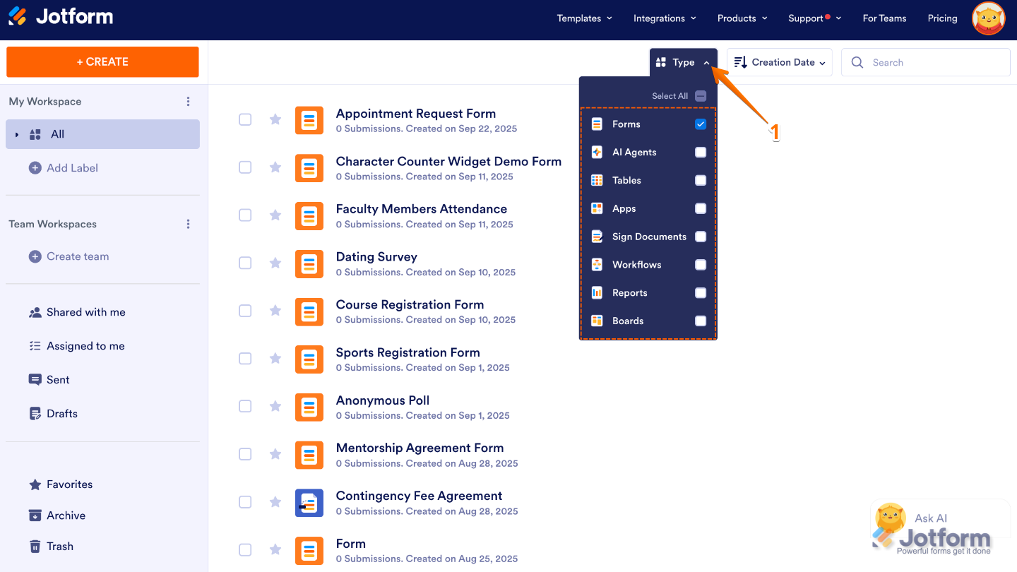 - On your My Workspace page, click on Type at the top and in the Dropdown menu that opens, uncheck the boxes next to all the assets except Forms, so only they’ll be shown on the page.