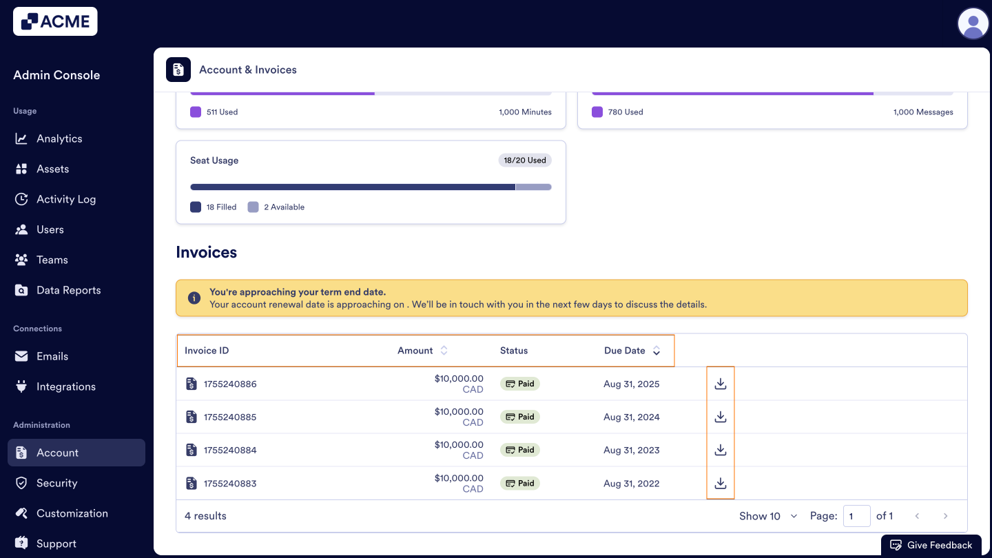 Under this tab, you can access all invoices associated with your organization. These invoices may include your annual contracts as well as additional features purchased later.