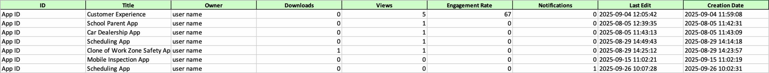 In this section, you can also download App data, that includes the App ID, Title, Owner, the number of downloads, the number of views, engagement rate, push notifications, last edit and creation date among other things: