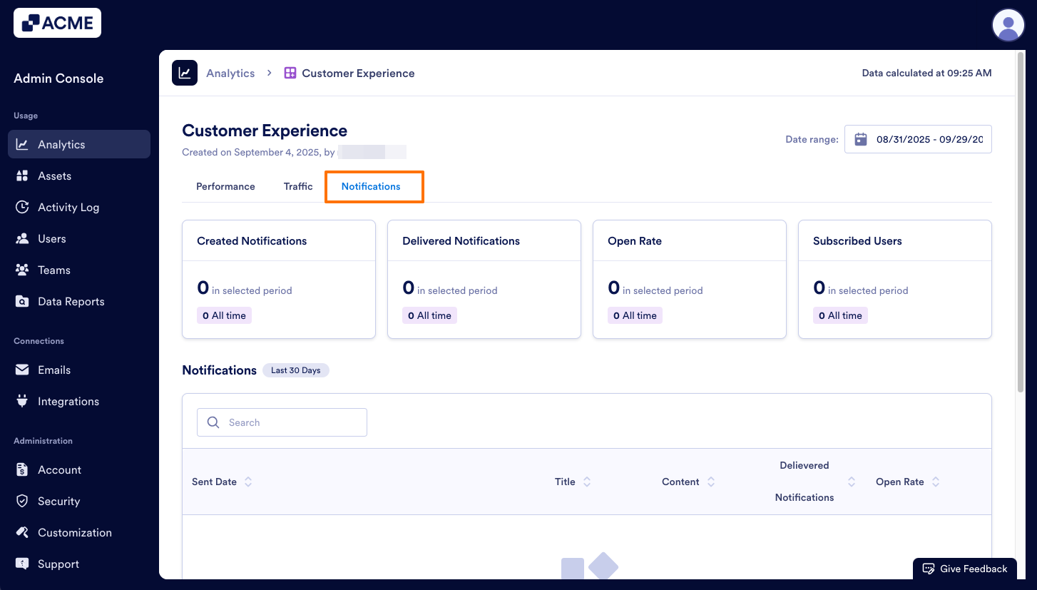 - In the individual App Analytics page, click on the Notifications tab.