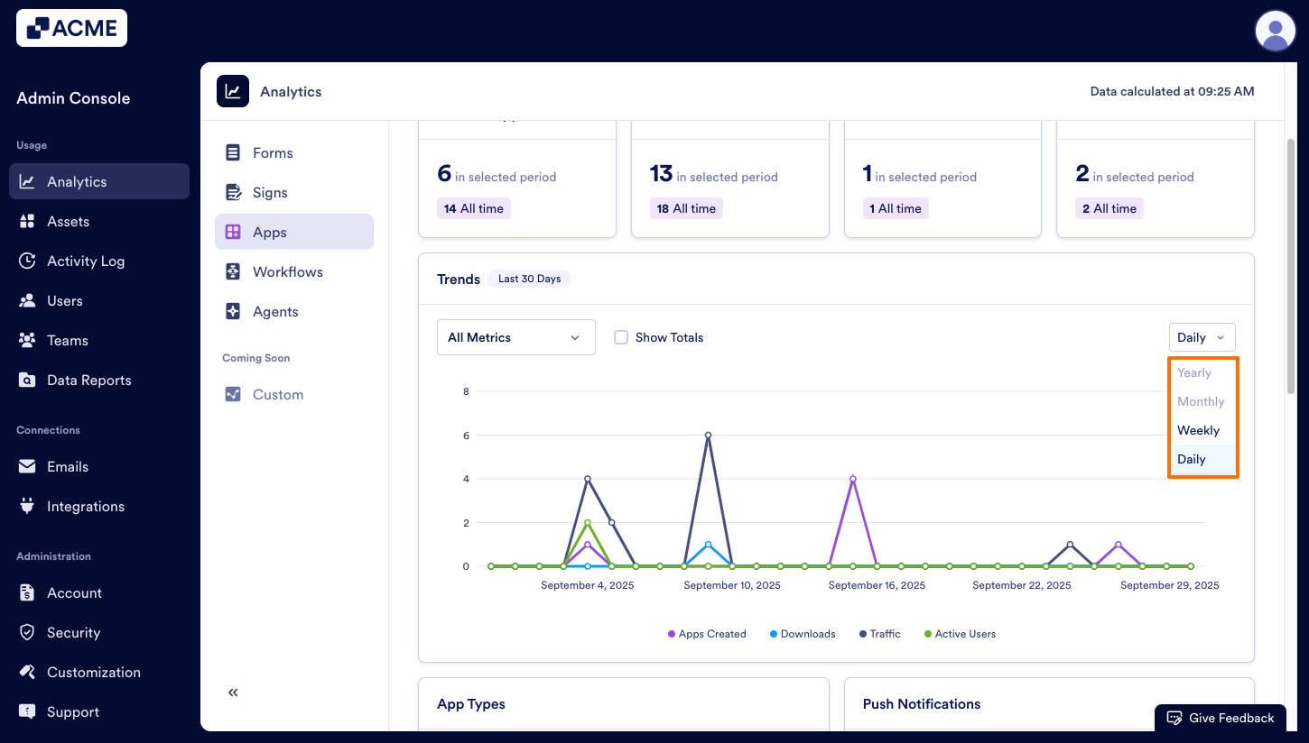 - Created Apps: The total number of apps created in your organization in a selected date range.