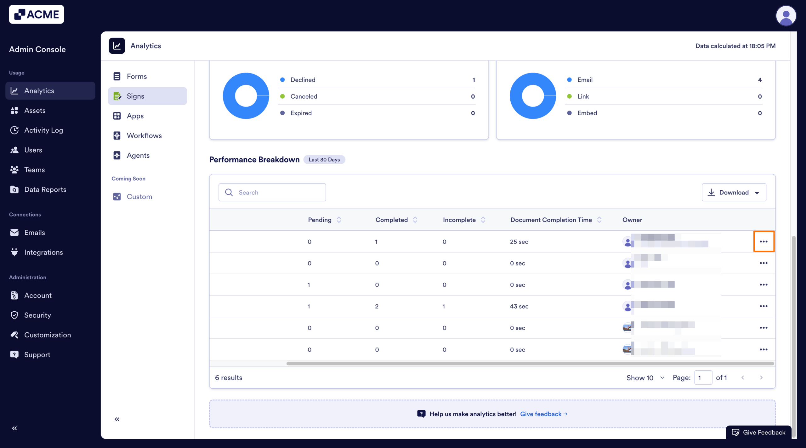 In this section, you will see the distribution of all sign documents created across the organization based on the selected date range. The list shows each document’s name, the number of pending, completed and incomplete documents, the document completion time during the selected period, and the document owner.