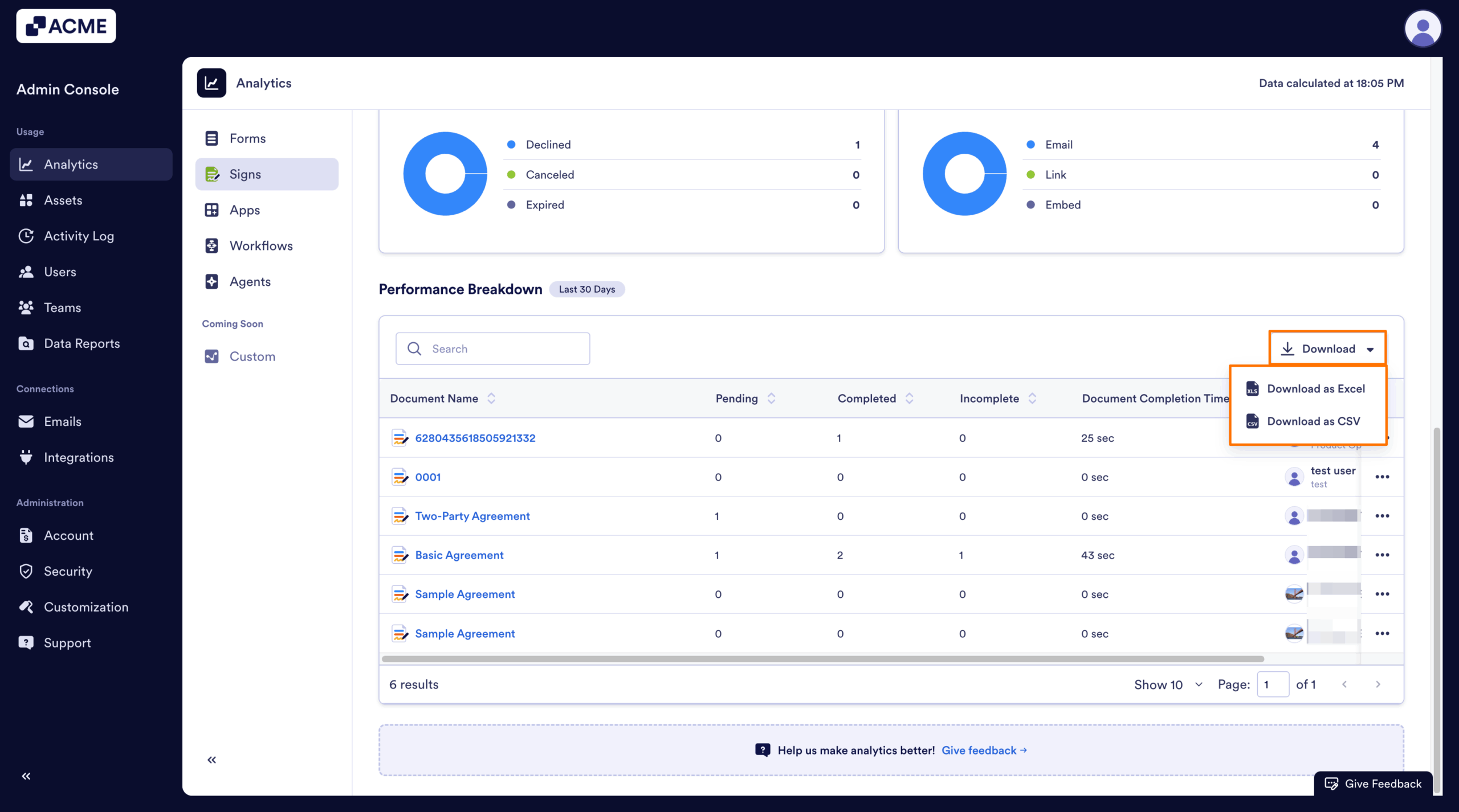 In this section, you can also download Sign Documents data, that includes document name, completion status (pending, completed, incomplete), document completion time and owner: