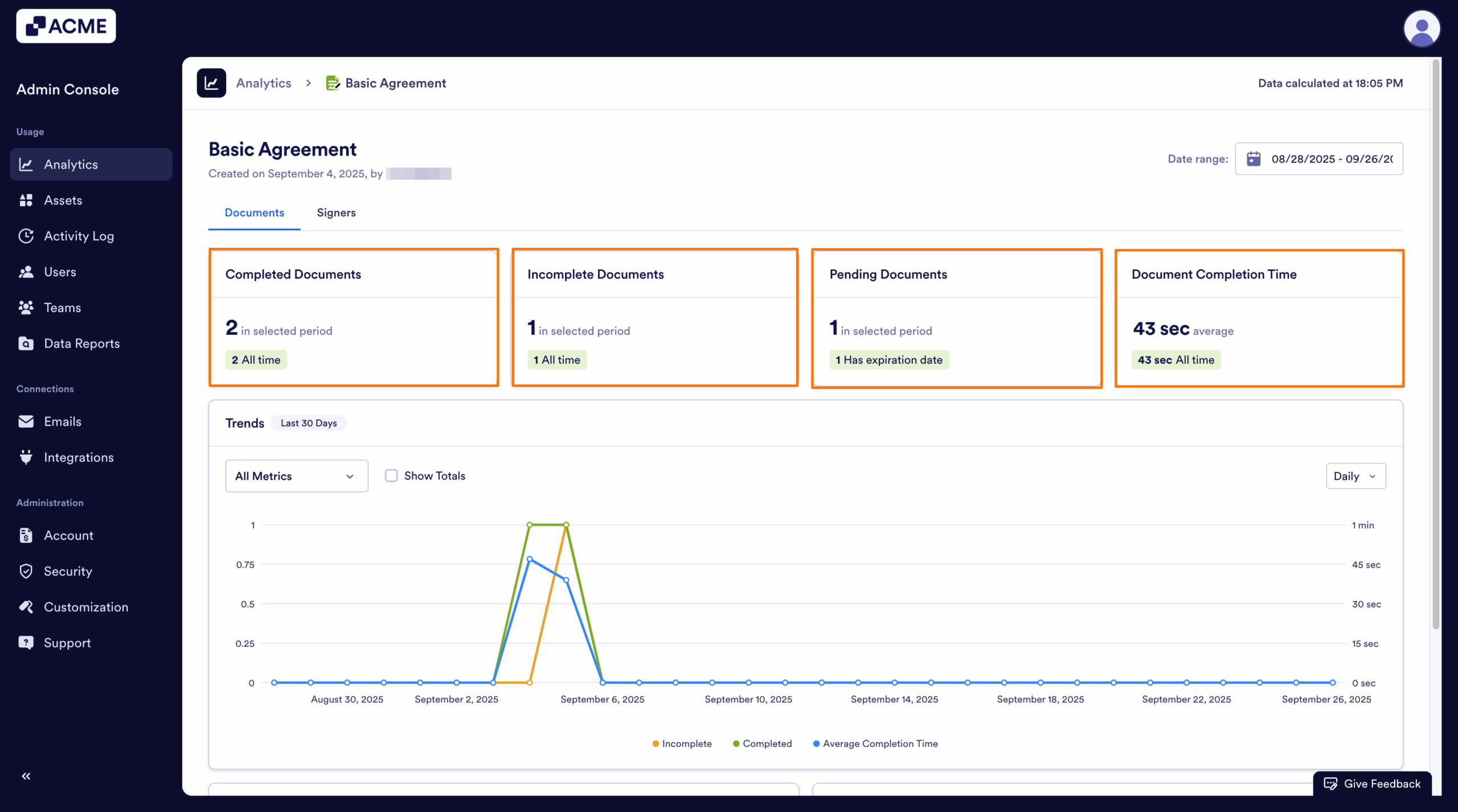 - Finally, under a single sign document analytic’s Documents tab, you will see cards displaying completed documents, incomplete documents, pending documents, and document completion time, along with a trends chart visualizing these metrics.