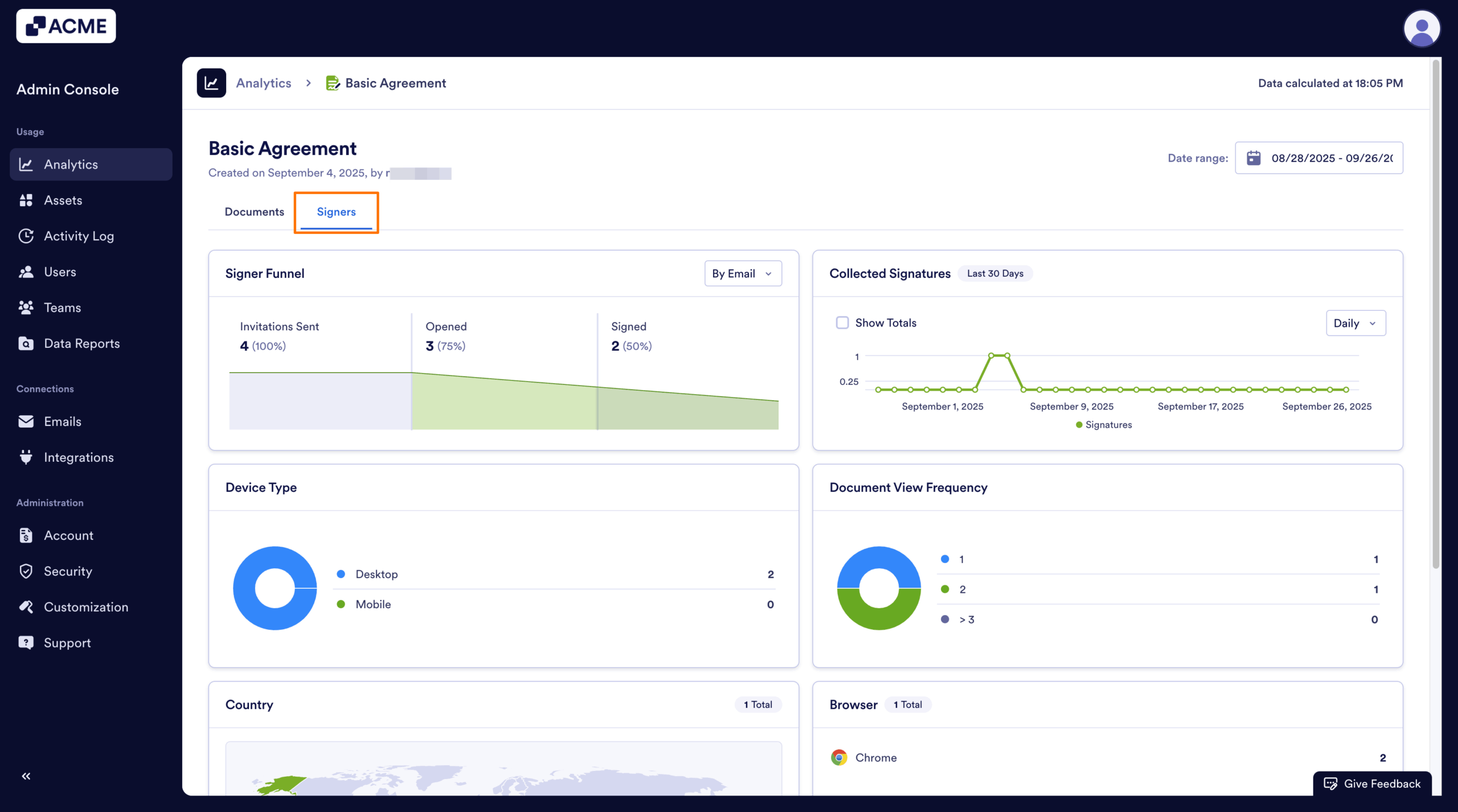 - Finally, go to the single sign document’s Signer tab, you will see cards displaying signer funnel, collected signatures, device type, and document view frequency, country, browser and operating system metrics’ cards.