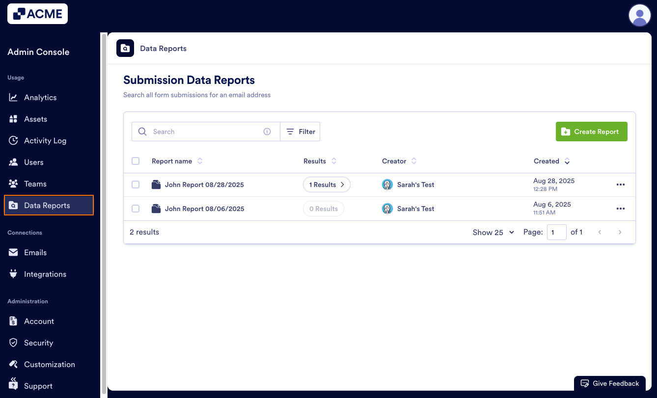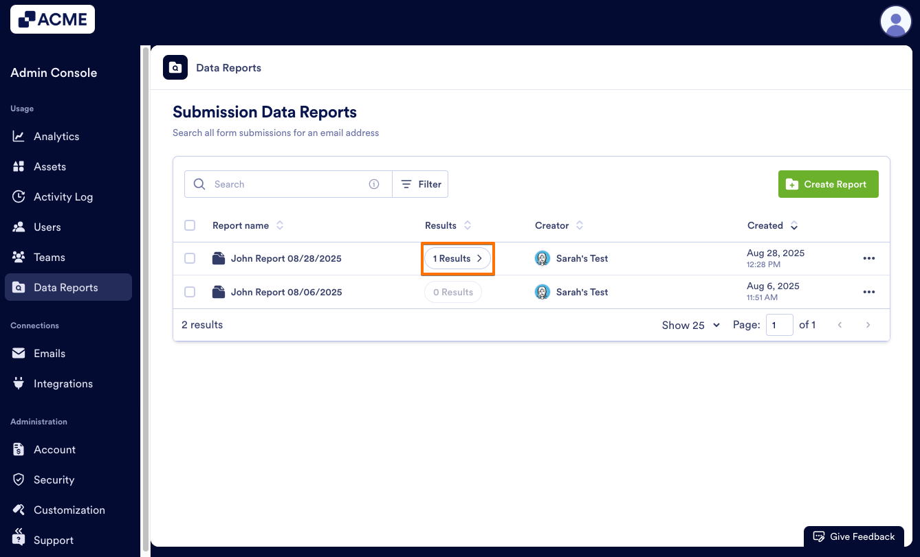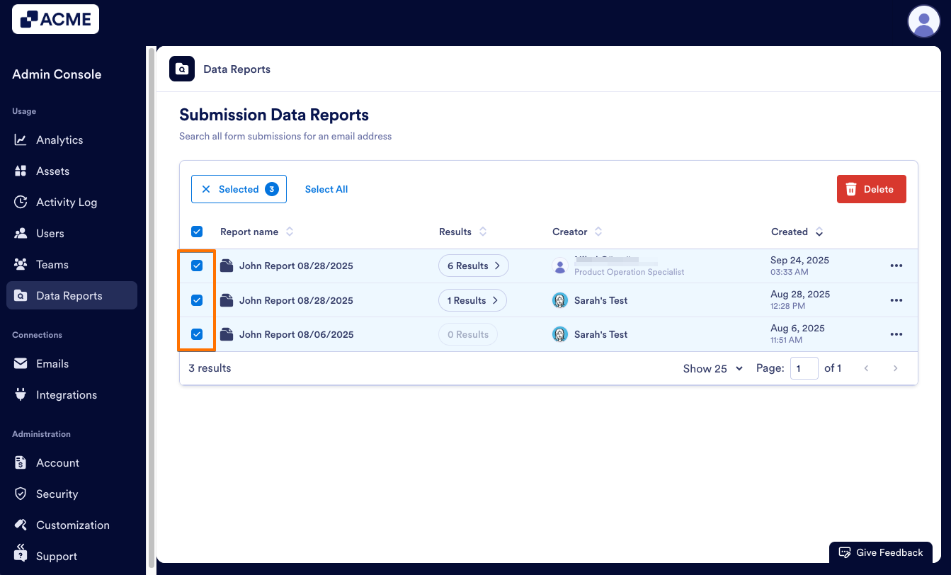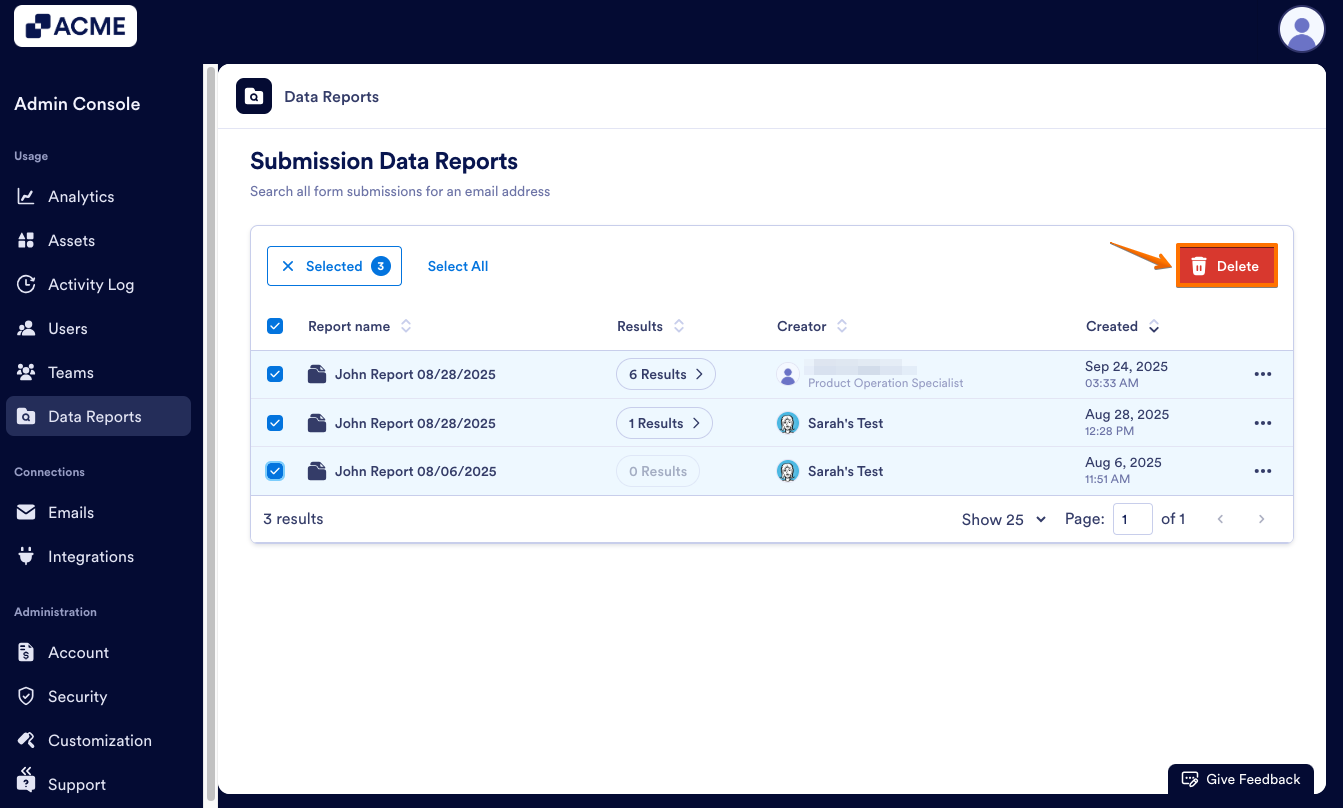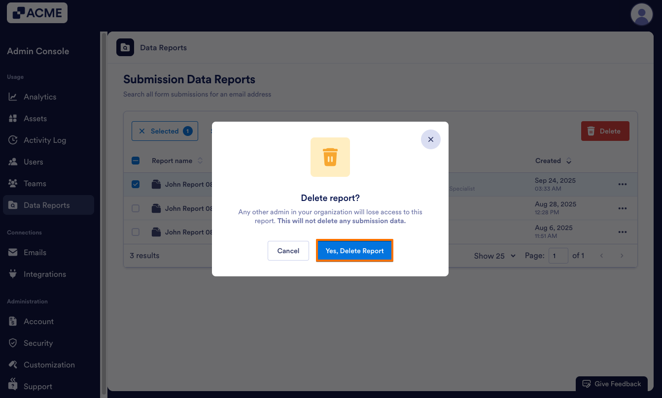 If you no longer need a report, you can delete it from the Data Reports landing page, either individually or in bulk. This only deletes the report, but not any submission data. Let’s walk through both, starting with deleting one report: