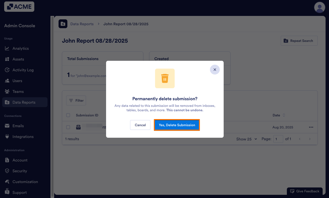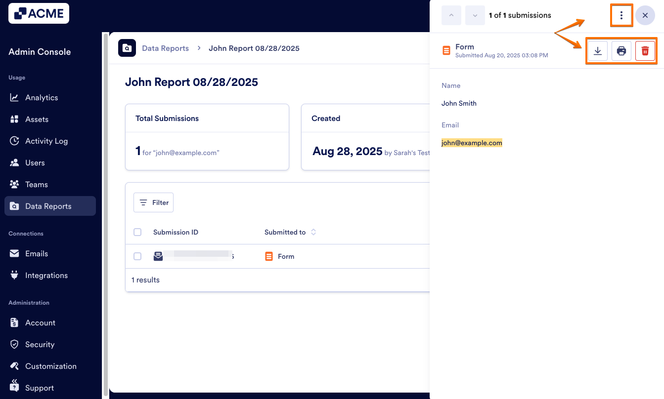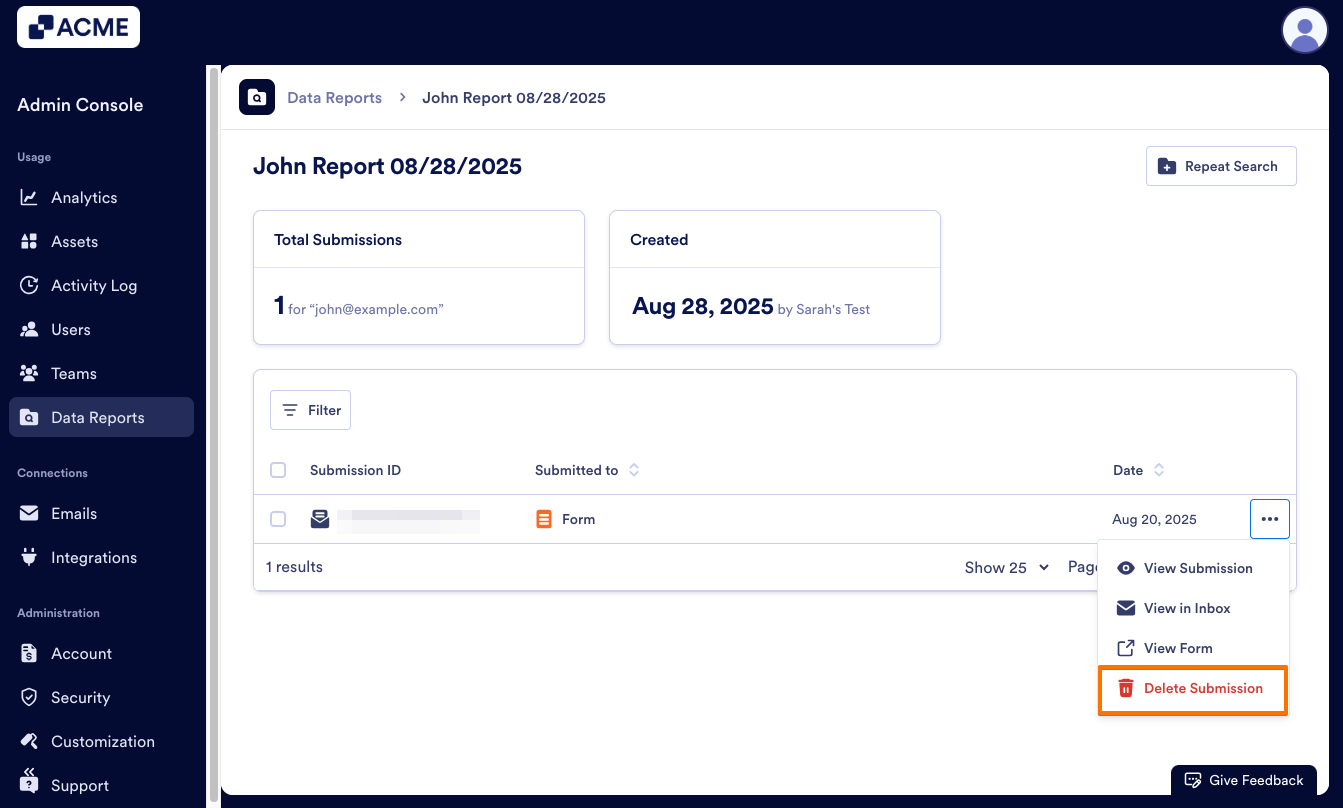 As an admin, you can find all submissions related to an email address in the Admin Console by creating a Report. Then, you can view, repeat, or delete the report as needed.