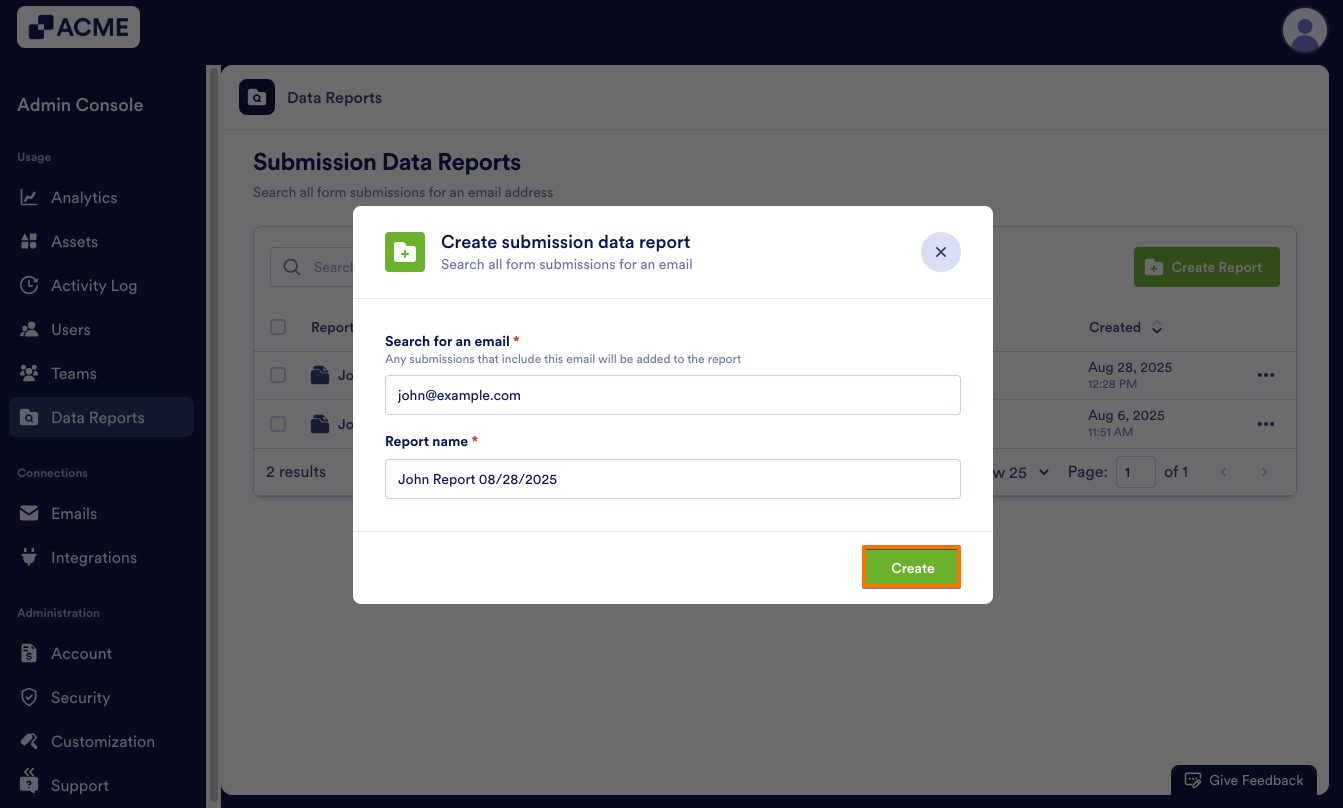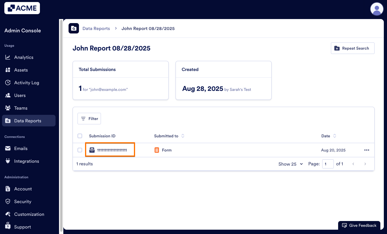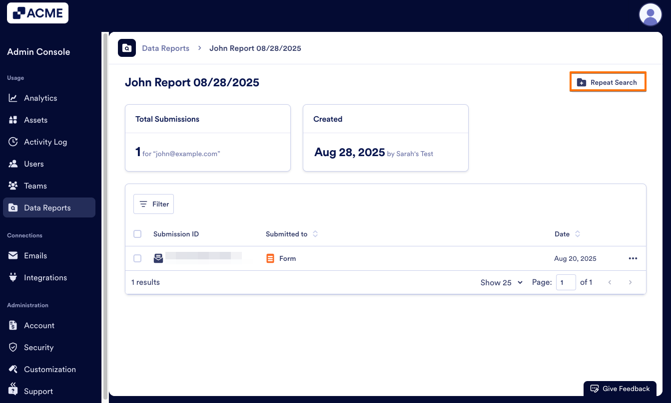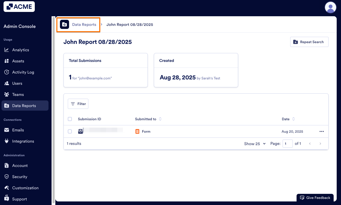 As an admin, you can find all submissions related to an email address in the Admin Console by creating a Report. Then, you can view, repeat, or delete the report as needed.