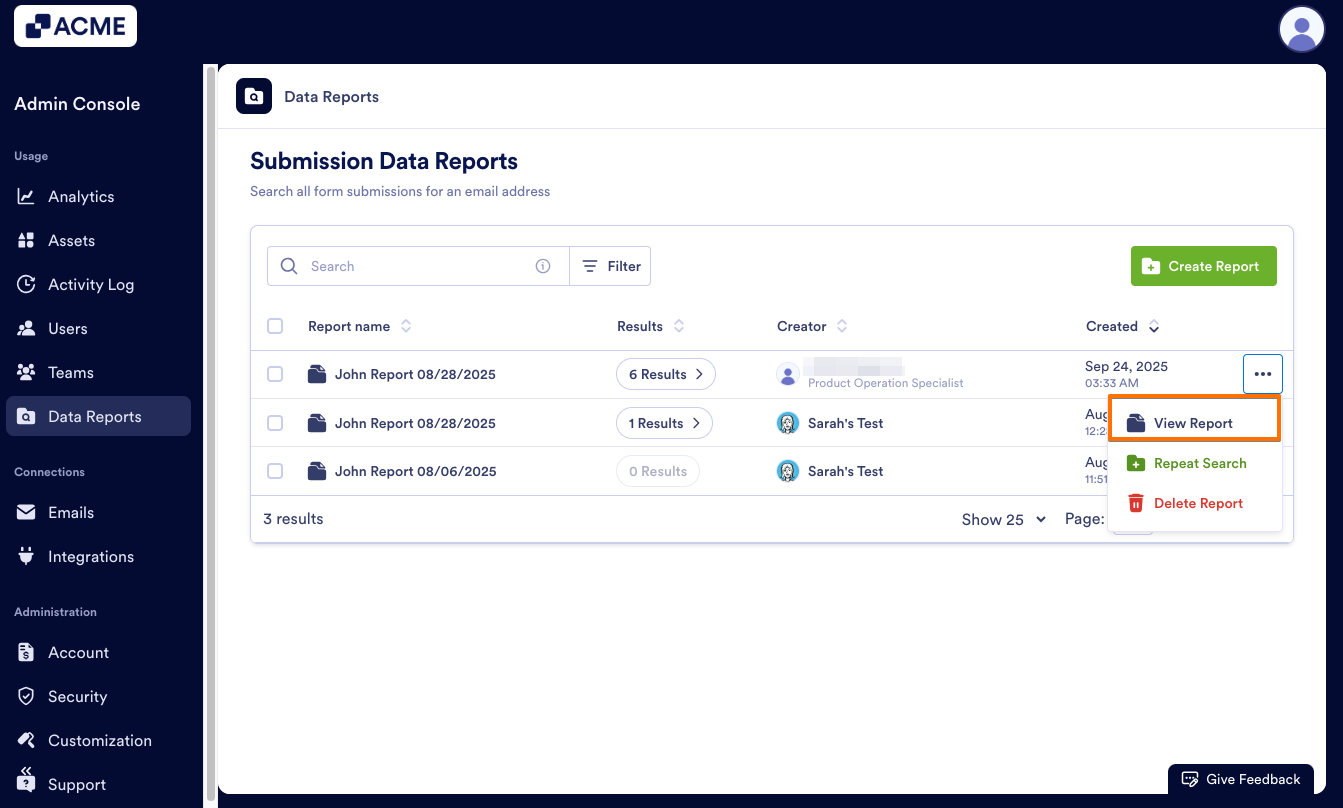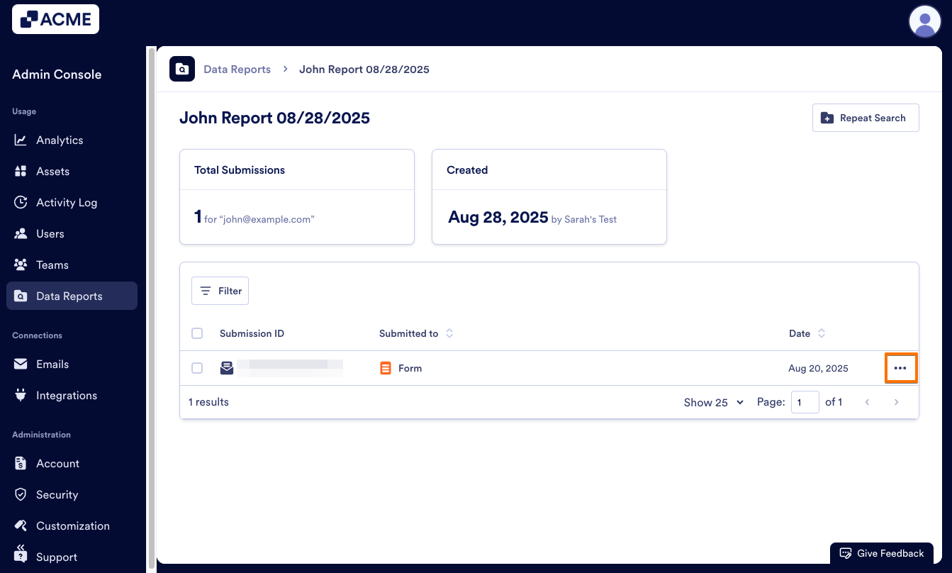 - In the Report, click on the three-dot menu next to the submission you’d like to view.