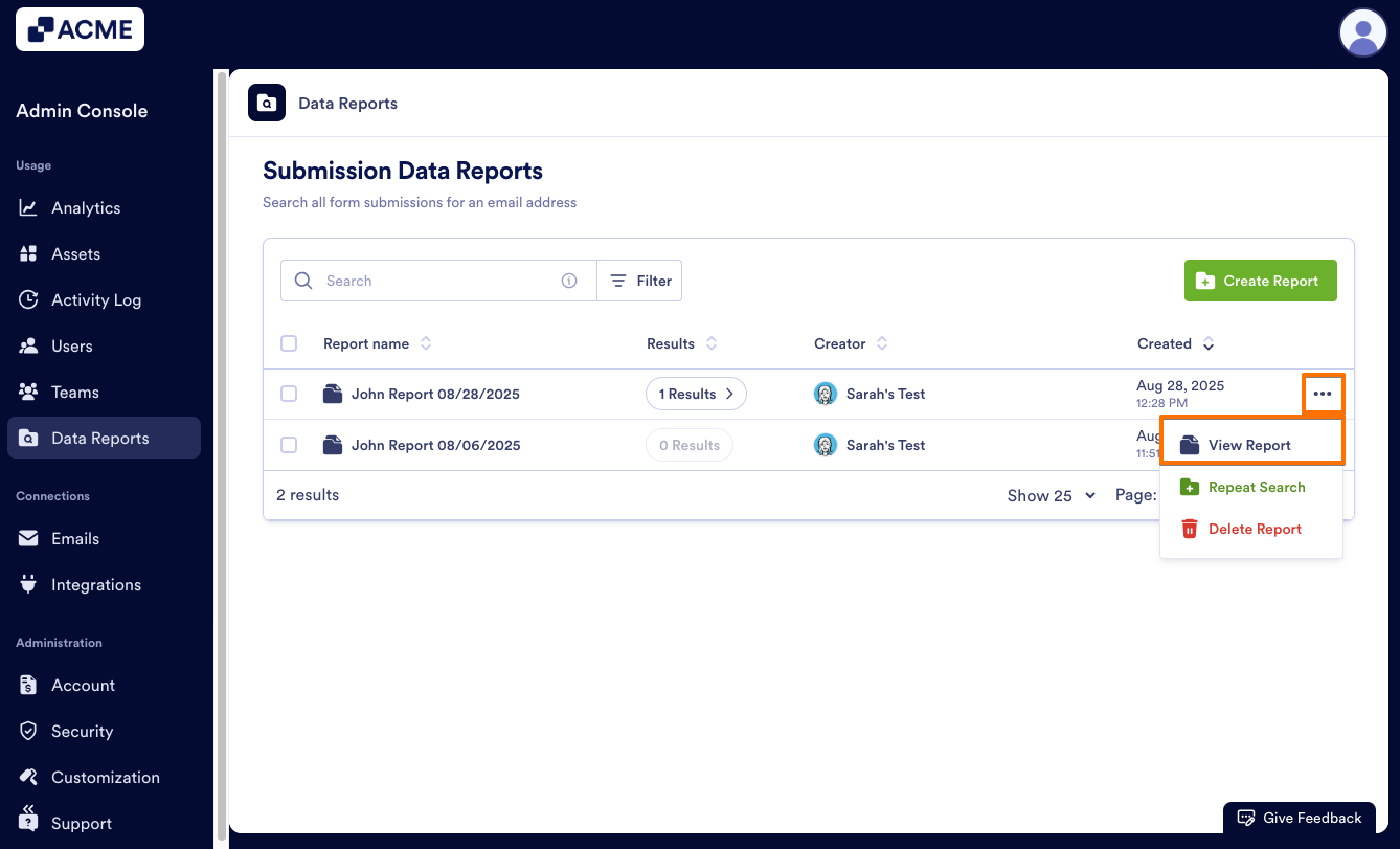 After the report is finished generating, you can view the results of the report. You can do this either by clicking on Results or opening the report from the three-dot menu. Let’s walk through this process together, starting with clicking on Results: