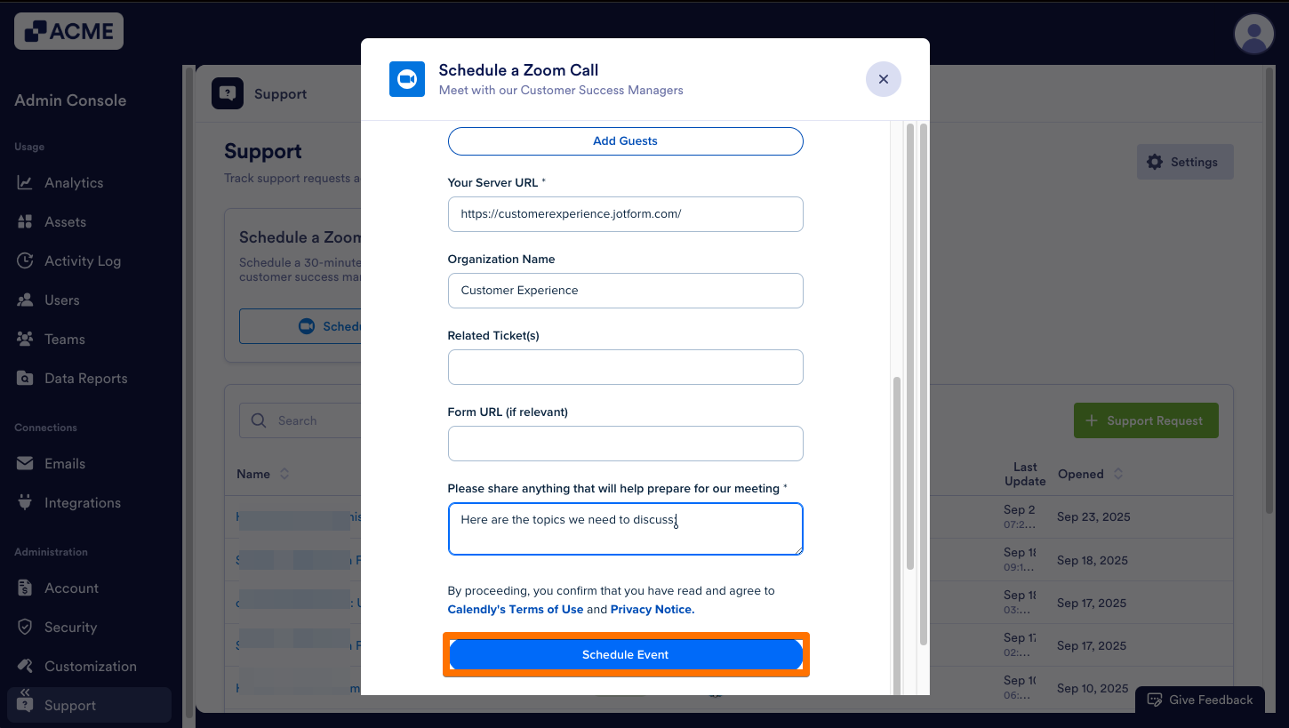 As an Admin, you can create and manage Support tickets for your organization from within the Admin Console. You can also schedule Zoom calls with CSMs and allow users to create Support Tickets and schedule Zoom calls.