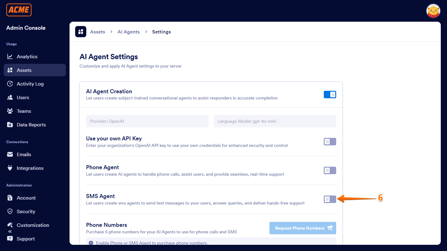 SMS Agent toggle switch in Settings of the AI Agents section under the Assets tab of the Enterprise Admin Console