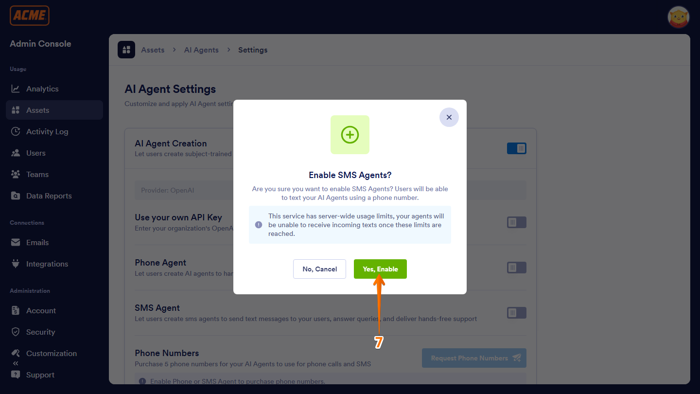 Once enabled AI Agent Creation Organization-wide from the Admin Console, enabling SMS Agent for your users is quick—here’s how: