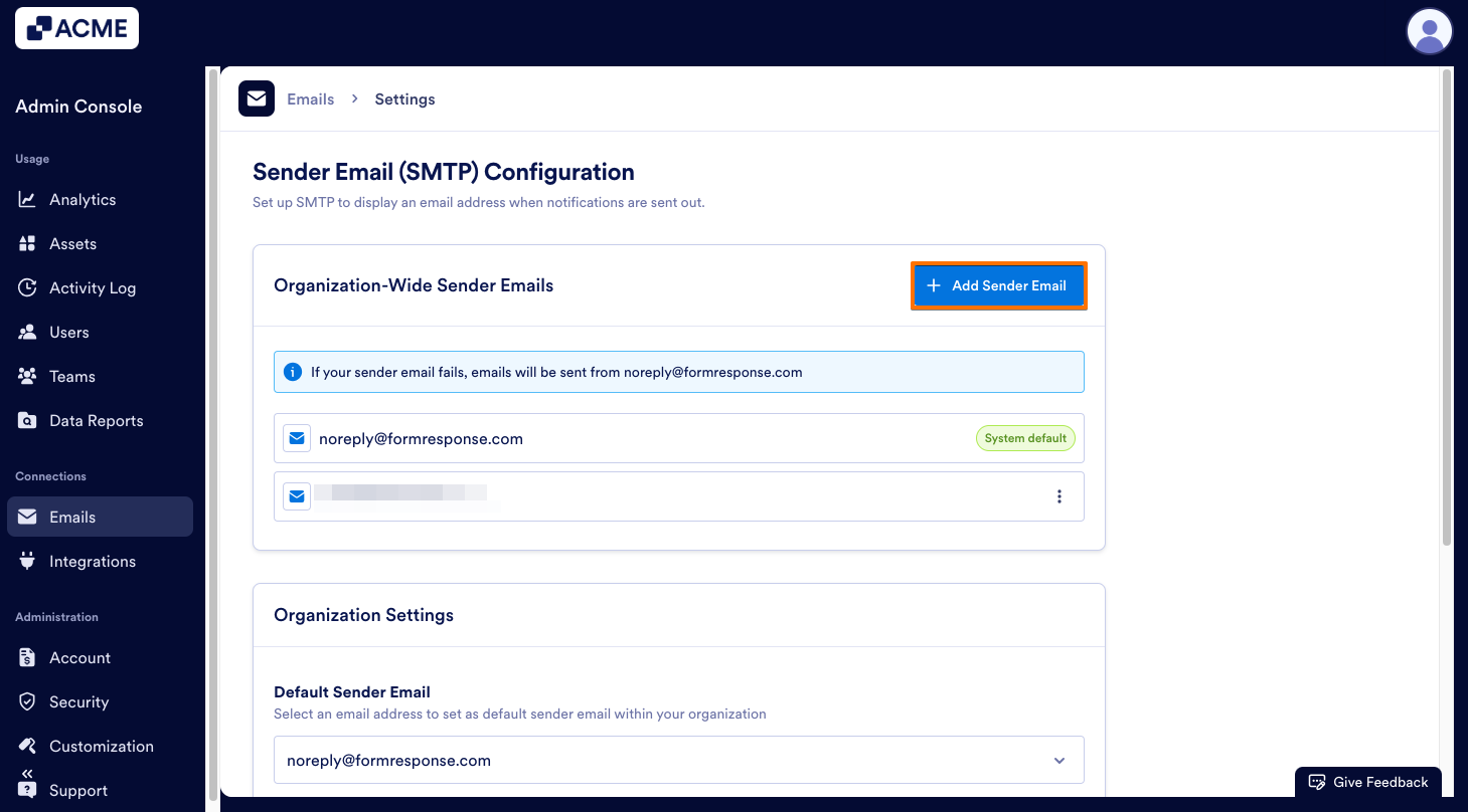 - In the Admin Console, select Emails under Connections.