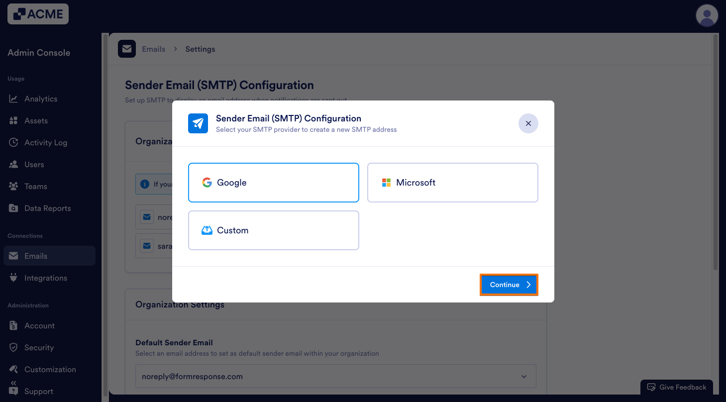 - In the pop–up window, select the SMTP provider and click Continue.