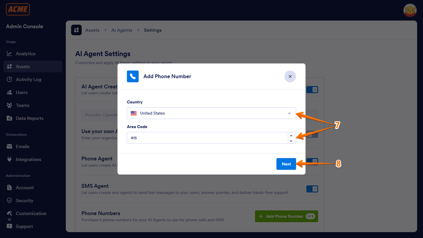 Once your request is approved and the invoice is paid, you can generate up to 5 phone numbers for your users to assign to their Phone and SMS Agents. Here’s how to get started: