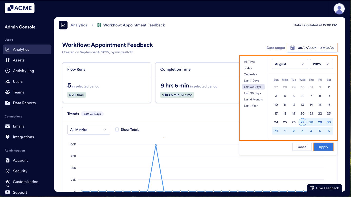 - In the Workflow Analytics, click on the Date Range to open the calendar.