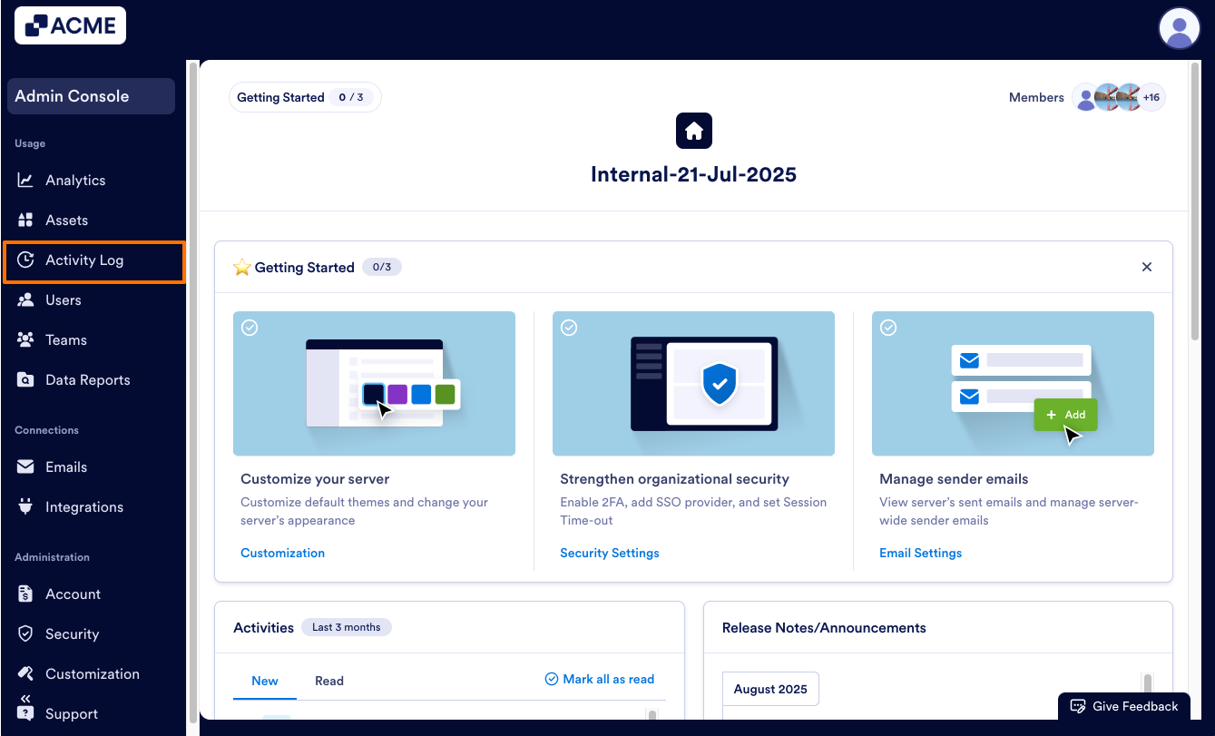 All non-email activity on your server is recorded and can be accessed in the Activity Log in the Admin Console.