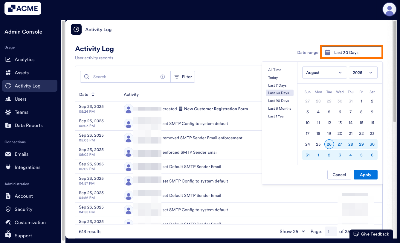 You can also search the Activity Logs based on keywords, like IP Address, Asset ID, User Name, or Asset Name and the date range currently applied to the Activity Logs. Let’s walk through this together: