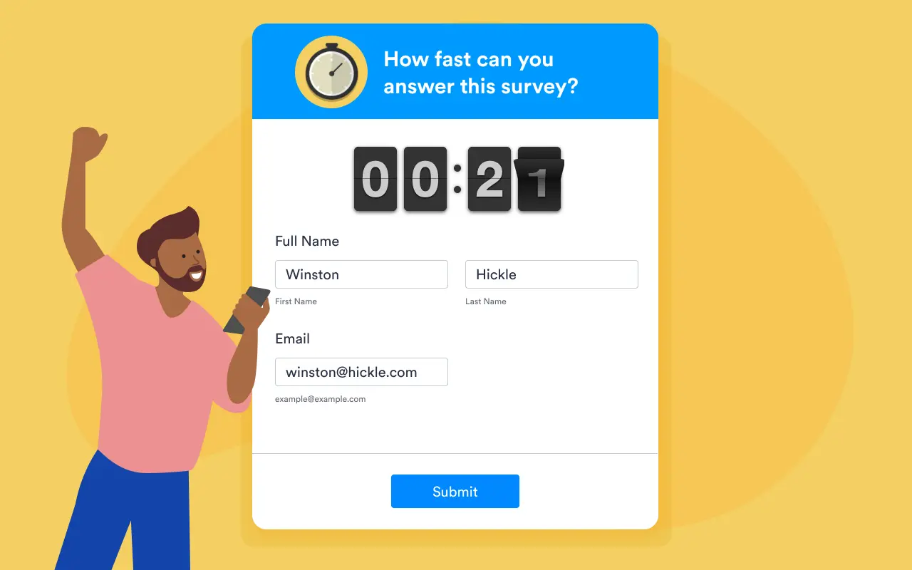 Jotformの無料タイマーウィジェットを使用して、フォームの入力にどれくらい時間がかかるかを確認しましょう。テスト、クイズ、または他の時間通りに記入が必要なフォームに最適です。タイマーを表示するか隠すか、時間を秒単位で見るか分単位で見るか、なども選択することができます。