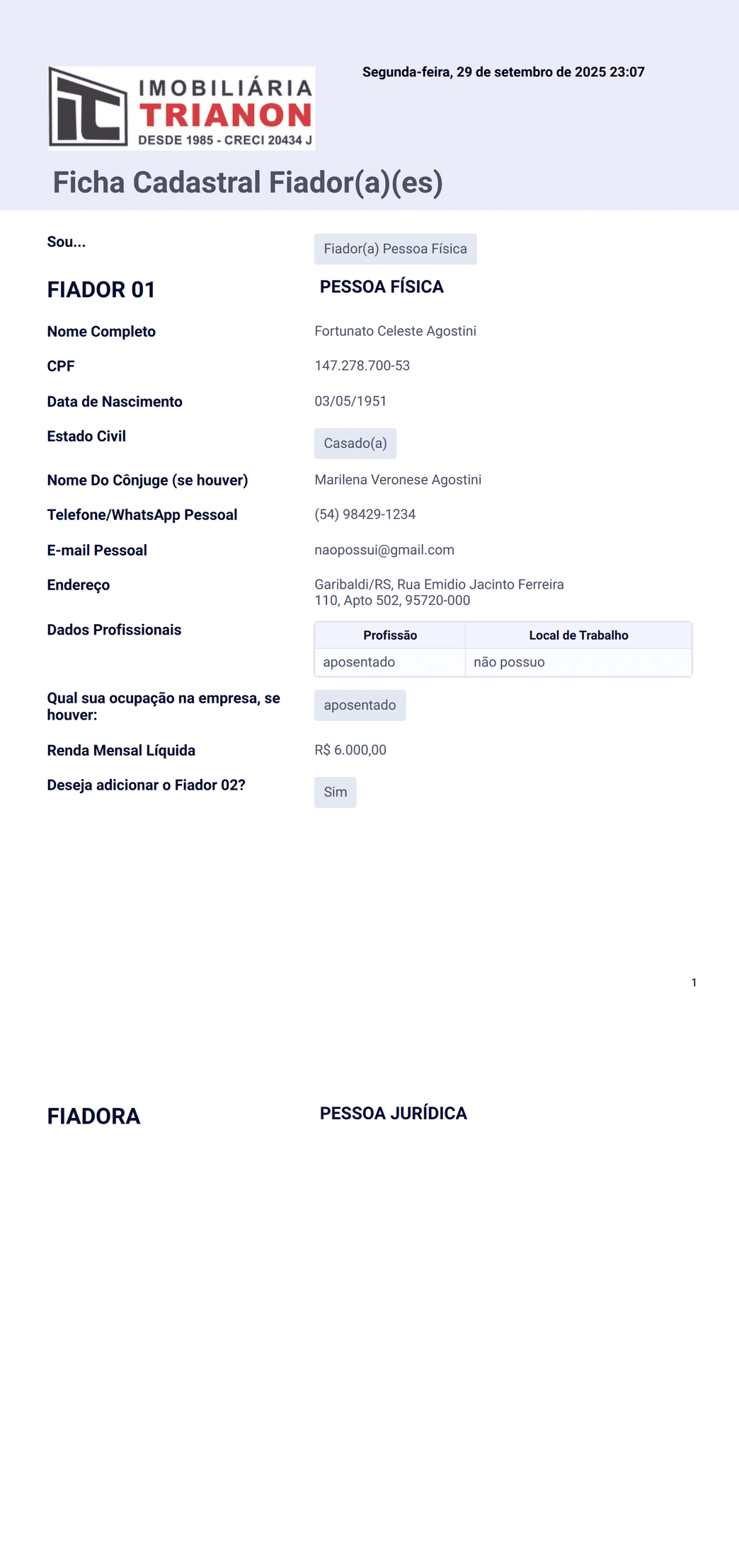 Ficha Cadastral Fiador(es)